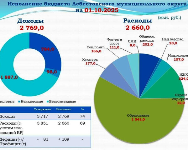 По состоянию на 1 октября 2025 года в бюджет поступило 2 769 млн рублей, что составляет 74% от годового плана (3 717 млн рублей).
