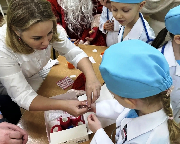Красивая повязка досталась и главному врачу. Юные медики с гордостью демонстрировали свои навыки, а гости терпеливо объясняли каждый шаг. Ребята на практике увидели, как важна и интересна профессия врача.