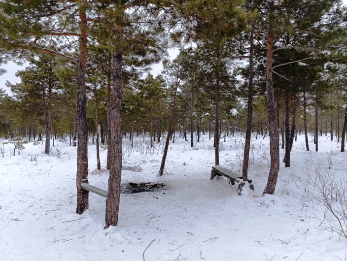 Недалеко от берега озера утоптанная площадка, оборудованы сиденья и в середине кострище, здесь иногда компании с детьми на костре жарят сосиски, пьют чай и слушают музыку из переносной колонки. Сегодня пусто, а вот разноцветные лазерные диски развешаны на кустах, видимо, вместо новогодних игрушек.