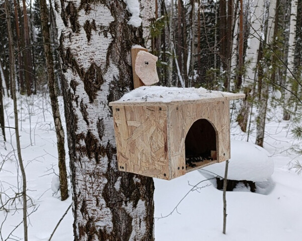 Недалеко от жилого сектора начинается заметное присутствие человека в лесу. В первую очередь, конечно, новогодний оттенок, стоит украшенная елка. Для детей это, конечно, сюрприз, хотя и у взрослых так же вызывает добрую улыбку. На многих деревьях развешаны кормушки, и, конечно, не зря.