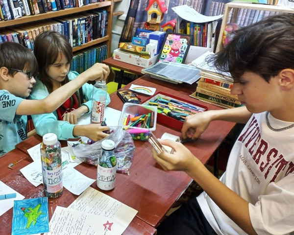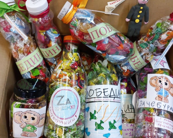 Читатели библиотеки, детские сады №31, 35, 47, "Кирпичики" и "Журавушка" вместе собрали более 160 сладких наборов и около 100 наборов с чаем и конфетами для бойцов. Дети сами оформляли подарки, рисовали трогательные этикетки, создавали открытки и даже делали маленьких чебурашек.