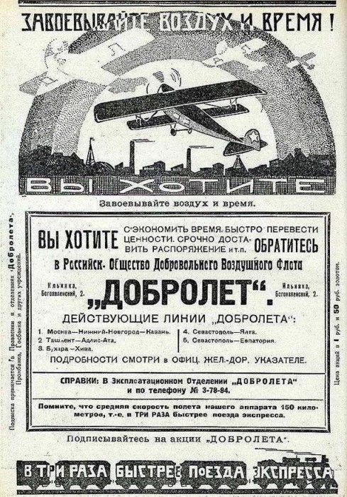 В 1923 году в России появилось Российское общество добровольного воздушного флота — «Добролёт». Акции этого общества были доступны для покупки населению, и для повышения интереса к авиации в середине 1920-х годов была запущена агитационная кампания, а с 1924 года были осуществлены агитационные перелеты по Уралу.