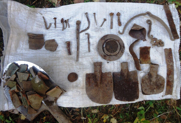 Здесь найдена решетка от вашгерда и несколько небольших штыковых лопаток-скребков применяемых для перелопачивания грунта на засыпной площадке вашгерда.