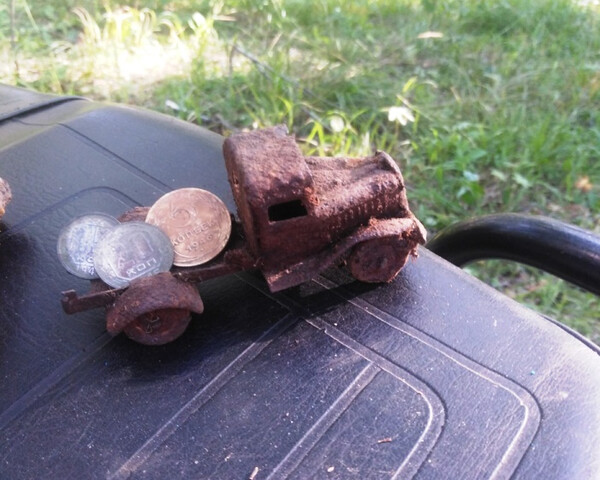 Игрушки из алюминиевой проволоки, это уже послевоенный период, детские машинки, печное литье, медные пряжки солдатская, морская и ремесленного училища с логотипом РУ-12. Большой металлический топор 1930-х годов с клеймом Златоустовского артельного завода.