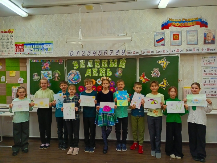 На уроке русского языка ребята писали экологический диктант, на окружающем мире рисовали охраняемые растения из Красной книги, на уроке труда изготовили цветы из цветной бумаги. Плодотворный день закончился викториной «Своя игра», в процессе которой дети узнали много нового и интересного. Победила команда «Экоколобки», капитаном которой была Шелковкина Виктория. А Махнёва Алисия признана лучшей в создании образа для «Зелёного дня».