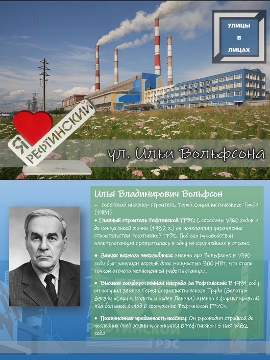 Илья Вольфсон был главным строителем Рефтинской ГРЭС с середины 1960-х годов и руководил стройкой вплоть до 1982 года.