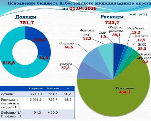 По состоянию на 1 апреля 2026 года бюджет Асбестовского муниципального округа демонстрирует планомерное исполнение.