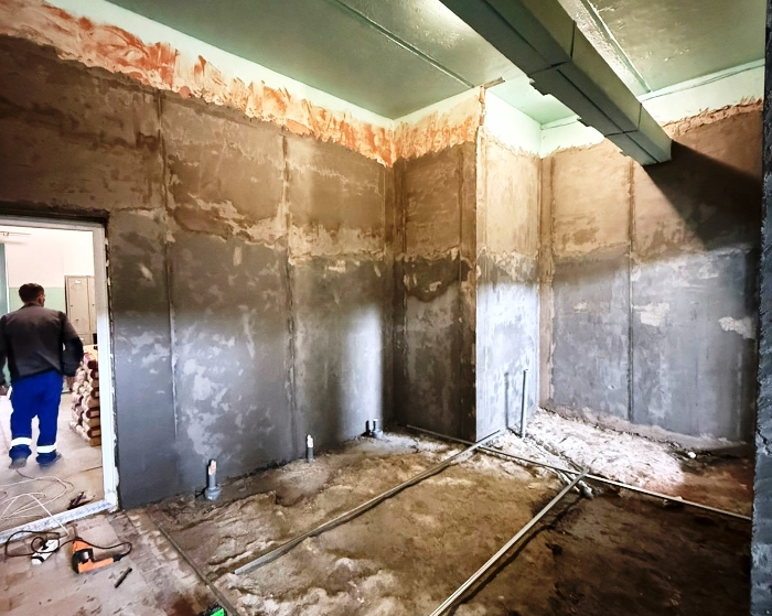 Ремонт душевых в бассейне идёт полным ходом. В данный момент уже демонтированы старые перегородки, выровнены стены, вскрыт пол и заменены канализационные трубы.