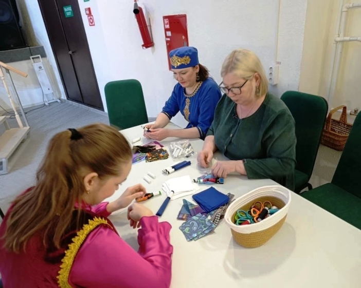 Руководитель студии народного творчества «Домоделка» Марина Житник провела для всех желающих мастер‑класс «Татарская парочка» — изготовление кукол на катушке ниток. Я создала двух кукол: парня (егет) — в тюбетейке, штанах и камзоле, подпоясанном поясом и девушку (кыз) — в юбке, кофте и платке, повязанном по‑праздничному. Я с большим удовольствием приняла участие в мастер‑классе, а ещё, по традиции праздника, загадала желание и привязала красную ленточку к ветке дерева, которое стояло в фойе здания.