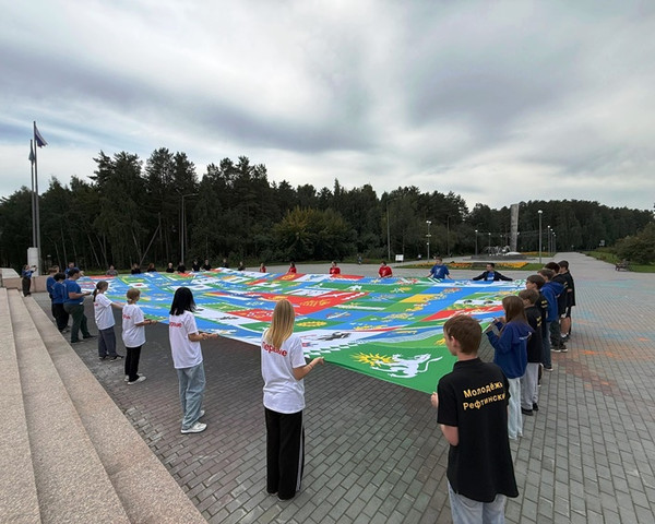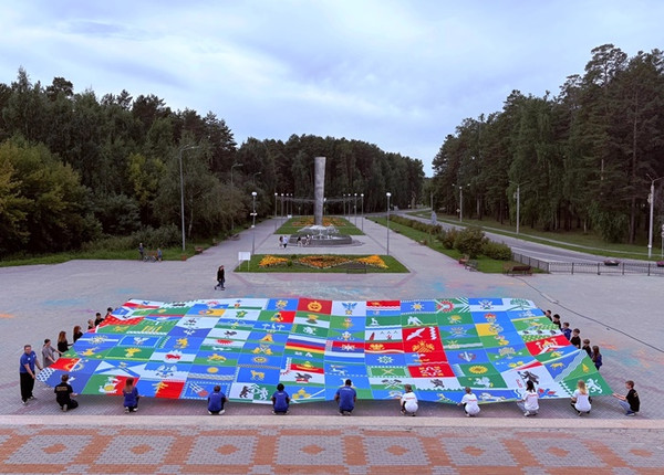 Молодогвардейцы вместе с участниками трудового отряда главы, активистами Движения Первых , юнармейцами и волонтерами развернули гигантское полотно размером 10×19,4 метра (194 м²) с флагами всех муниципалитетов Свердловской области.