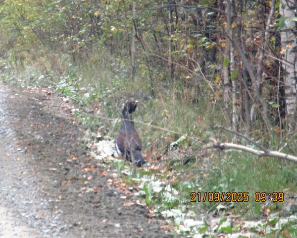 На дороге встретили глухаря. Он нас не сильно испугался, перелетел метров на 100 вперед и, дождавшись нас, дал себя сфотографировать.