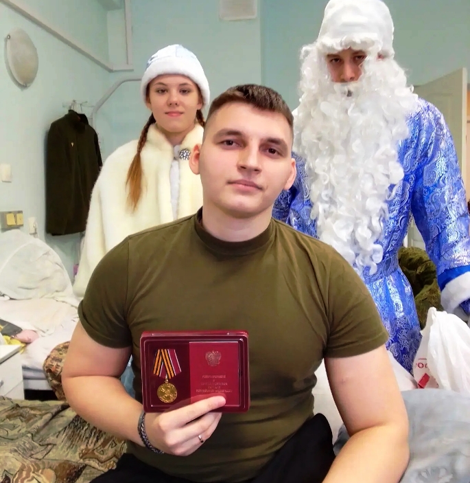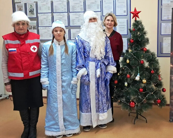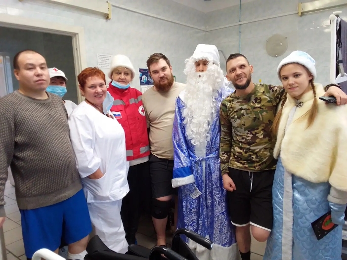 Волонтеры филиала - Дед Мороз и Снегурочка - вместе с руководителем Асбестовского отделения Красного Креста Надеждой Комар доставили праздничные наборы пациентам военного госпиталя г. Екатеринбурга - участникам СВО.