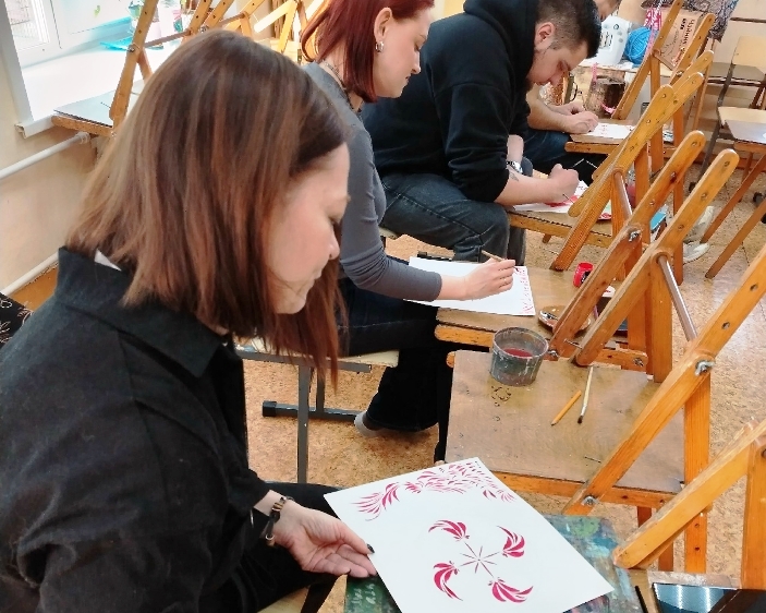 Под чутким руководством Ольги Владиславовны Пинегиной мастера обратились к истокам. Темой встречи стала традиционная народная роспись. На мастер-классе педагоги филигранно вписывали классический хохломской орнамент в круг. Тончайшие травинки, наполненные смыслом и жизнью народа — каждый автор привнес в канонический узор свой почерк, еще раз доказав, что народное искусство вечно и бесконечно вариативно.