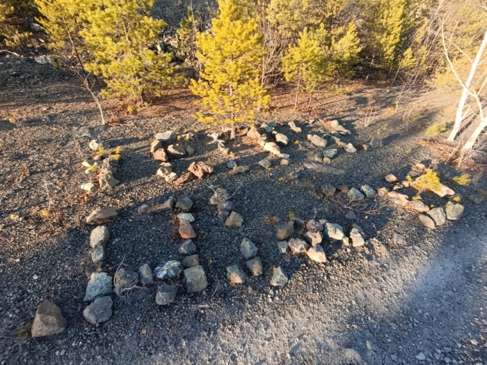 Кроме того, можно сказать, что на верху отвала на II ярусе дороги накатаны, кто-то ездит по каким-то своим делам или просто катается. На бывшем автомобильном съезде из камней выложена надпись.