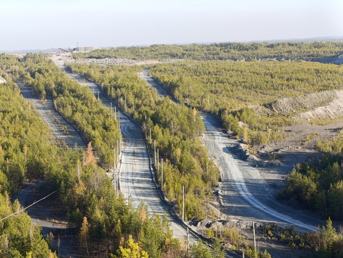 Южнее проглядывается огромный отработанный бункер, здесь в перестройку грузили бедные руды на ж.д. транспорт и вывозили на обогатительную фабрику.А вдалеке на восточном направлении видны элементы дробильно-сортировочного комплекса и конусы готовой продукции — щебенки. Простым глазом видны даже цветовые фрагменты высоких ленточных транспортеров.
