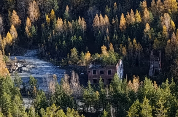 Осень, лес в желтых, красных, оранжевых тонах. Внизу останки двухэтажного почти полностью разрушенного здания станции Отвальная.