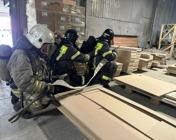 По условиям тренировки было смоделировано условное возгорание в одном из помещений лесопильного цеха.