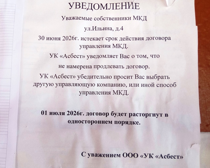 Жители двухэтажек на улицах Советская, Ильина, Пионерской получили уведомления о том, что управляющая компания - УК "Асбест" по истечению договора (он истекает 30 июня) продлять его не намерена. Жителям предложено выбрать другую УК.
